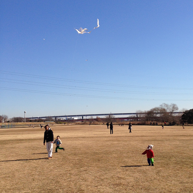 河川敷で凧あげ。子供頃よくやった、、、という記憶はない。